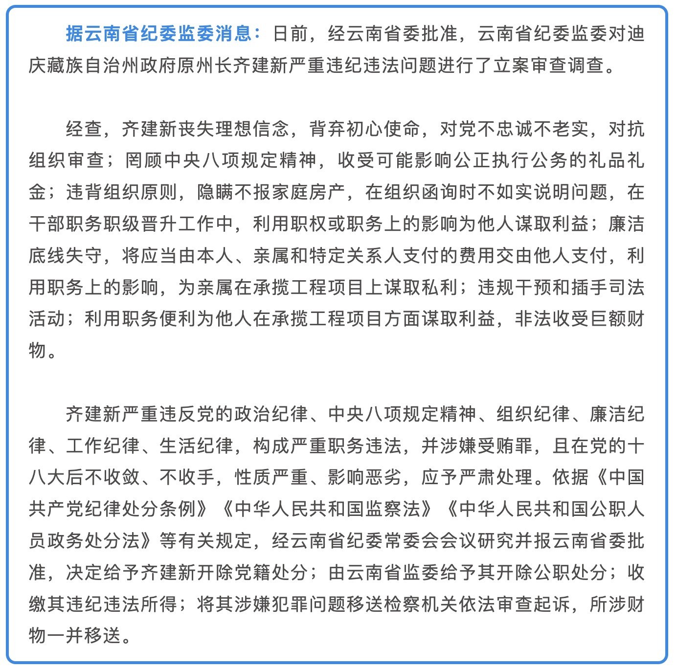 齐建新严重违反党的政治纪律、中央八项规定精神、组织纪律、廉洁纪律、工作纪律、生活纪律,构成严重职务违法,并涉嫌受贿罪,且在党的十八大后不收敛、不收手,性质严重、影响恶劣,应予严肃处理。依据《中国共产党纪律处分条例》《中华人民共和国监察法》《中华人民共和国公职人员政务处分法》等有关规定,经云南省纪委常委会会议研究并报云南省委批准,决定给予齐建新开除党籍处分;由云南省监委给予其开除公职处分;收缴其违纪违法所得;将其涉嫌犯罪问题移送检察机关依法审查起诉,所涉财物一并移送。